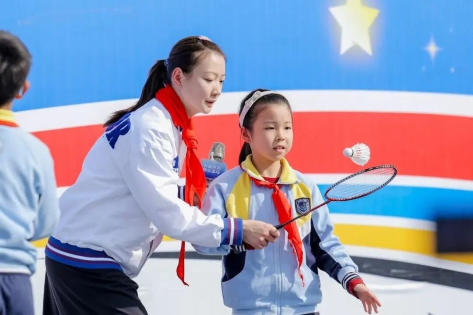 紧接着,巴黎奥运会羽毛球混双冠军黄雅琼接过“互动接力棒”,与孩子们玩起颠球游戏。“手腕放松,跟着球的节奏走”,她弯腰纠正孩子的姿势,指尖轻扶小队员的手腕,耐心又温柔。颠球最多的孩子拿到签名球拍时,激动地说:“我以后也要像雅琼姐姐一样,好好练球!”